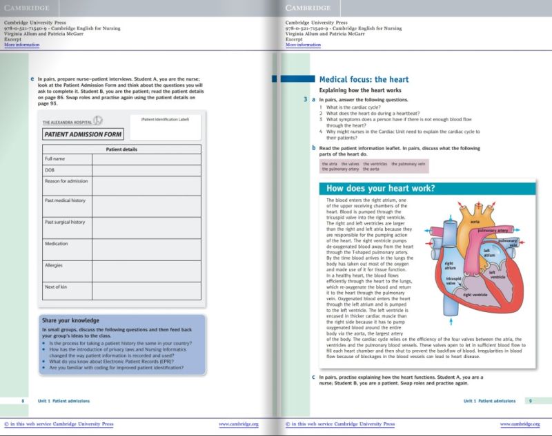 "Cambridge English for Nursing" включва учебен материал за от 40 до 60 часа и е разработен от квалифициран екип, включващ медицинска сестра и методист с голям опит.
